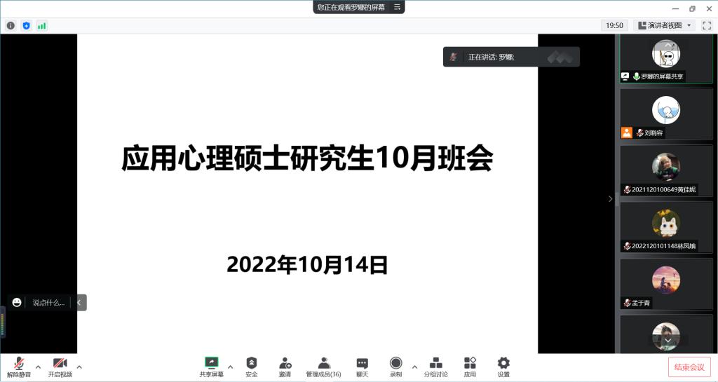 10月14日晚,公司召开了应用心理硕士研究生10月主题班会,会议由班主任罗娜主持,全体研究生参会。会上,罗娜组织全体研究生学习了贵州省教育厅和《关于恢复线下教学相关工作的通知》(校疫防办发〔2022〕25号)文件精神,并对近期疫情防控、恢复研究生线下教学、研究生安全稳定等工作进行安排部署。会议强调,首…