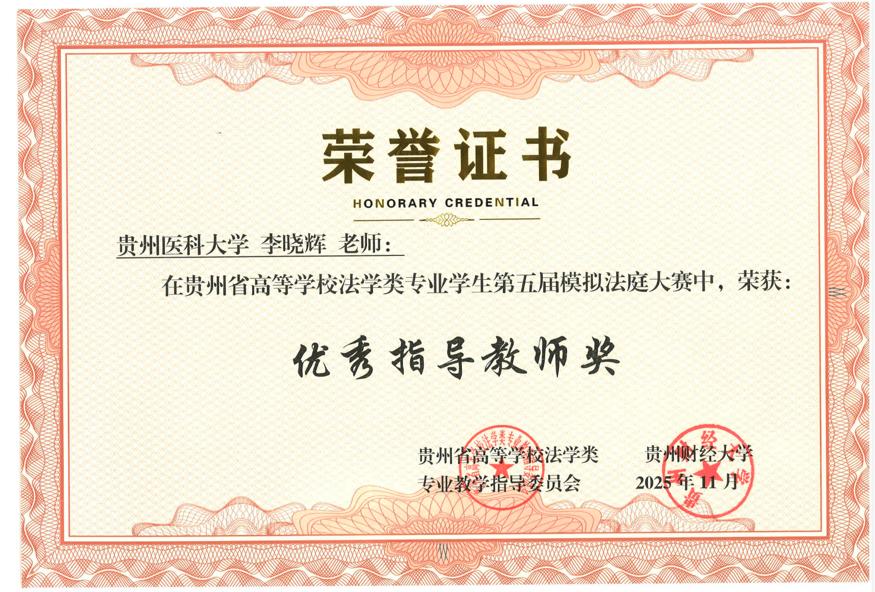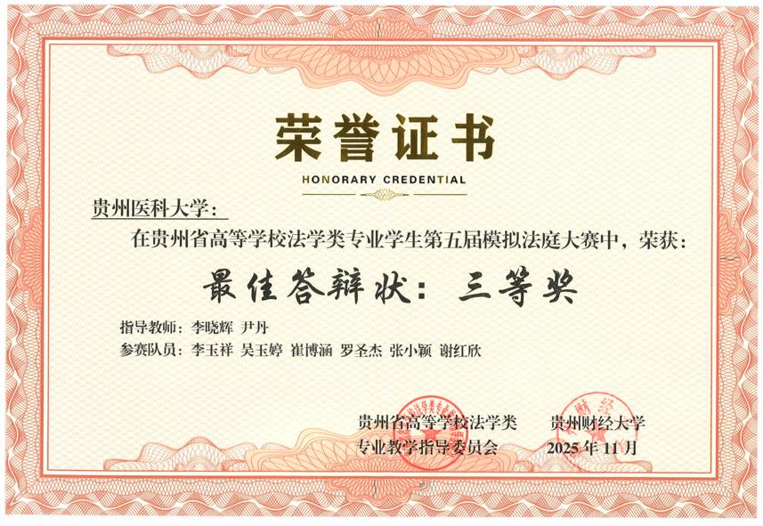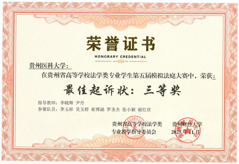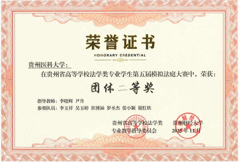 2025年11月22日,贵州省高等公司法学类专业员工第五届模拟法庭大赛在贵州财经大学圆满落幕。公司365英国上市公司李晓辉、尹丹两位老师带队指导,李玉祥、吴玉婷、崔博涵、罗圣杰、张小颖、谢红欣6名本科生组成参赛团队,历经初赛、复赛两轮激烈比拼,以总排名第三的优异表现蝉联“团体二等奖”,同时斩获“最佳起诉状三等奖”“最佳答辩状三等奖”两项单项荣誉,李晓辉、尹丹老师获评“优秀指导教师奖”。