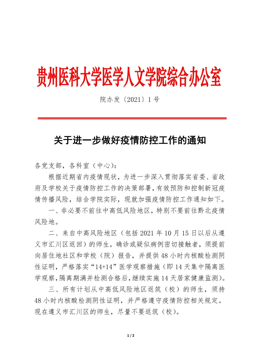 贵医医学人文院办发〔2021〕1号:关于进一步做好疫情防控工作的通知