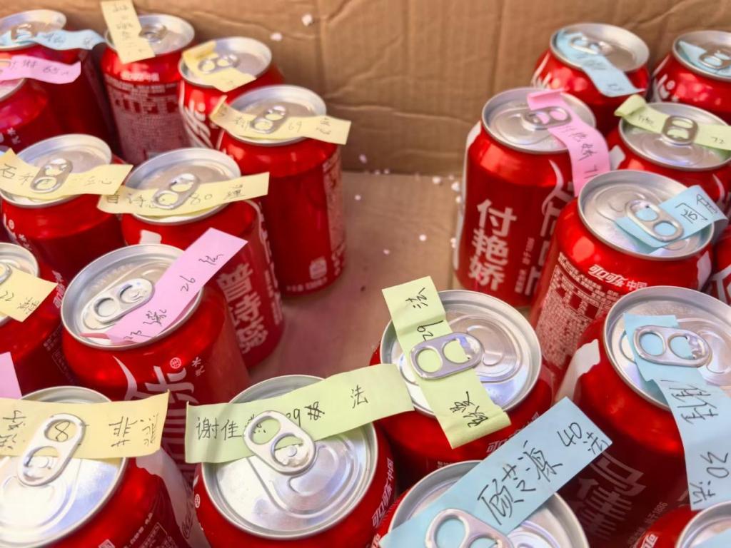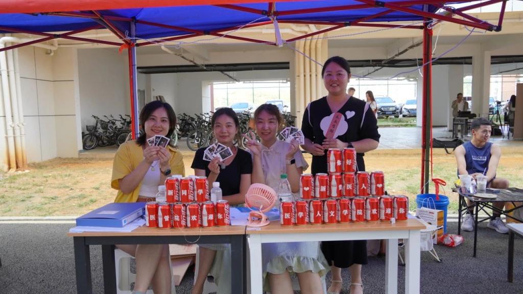 在公司新生报到点,考虑到天气炎热,公司为每一位新同学定制了个人姓名的可乐和带有祝福语的扇子,希望在炎炎烈日中为新生送去一丝凉爽。