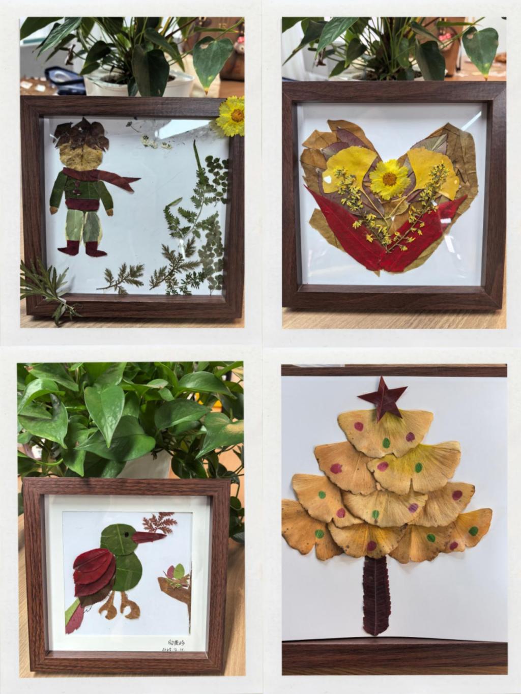 活动中,员工以深秋时节的落叶为自然笔触,将叶片的形态肌理与斑斓色彩化作创意语言:深浅交织的叶片拼缀成中国地图,在自然纹理中藏纳家国情怀;经巧手塑形的叶片还原《小王子》的经典场景,借叶脉纹路勾勒故事的温柔意境;灵动的碎叶组合成振翅欲飞的小鸟,薄透叶片层层叠叠晕染出蝴蝶的斑斓羽翼,细长三角叶则精准拼出蜻蜓的轻盈身姿;更有金黄银杏叶铺展成灵动“生命树”,以扇形叶瓣的独特弧度诠释生命的蓬勃意象,每一幅作品都让自然之美与人文哲思在方寸相框中悄然交融。据活动后问卷反馈,参与员工对活动满意度高达93.75%,纷纷表示“此类活动非常有趣且富有深意;在艺术创作中释放压力,感到身心愉悦;希望参加更多类似的手工减压活动。”