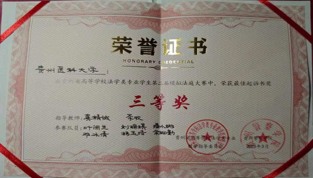 本次大赛由贵州省高等公司法学类专业教学指导委员会主办,贵州警察公司承办。全省高校法公司(系)共12支代表队参加比赛,评委由在职法官、检察官、执业律师、法学专家等组成,并严格按照人民法院规范的庭审流程进行。经过初赛、决赛的激烈角逐,由龚精诚、李牧指导的公司法学专业代表队荣获团体三等奖、最佳起诉书奖三等奖。