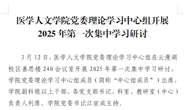 3月12日,医学人文公司党委理论学习中心组在云漫湖校区善思楼240会议室开展2025年第一次集中学习研讨,公司党委理论学习中心组成员出席,公司副科级以上干部、各党支部书记、科室、教研室(中心)负责人列席。公司党委书记江宣成主持。学习会上,江宣成领学了《习近平关于全面加强党的纪律建设论述摘编》“加强纪律建设是…